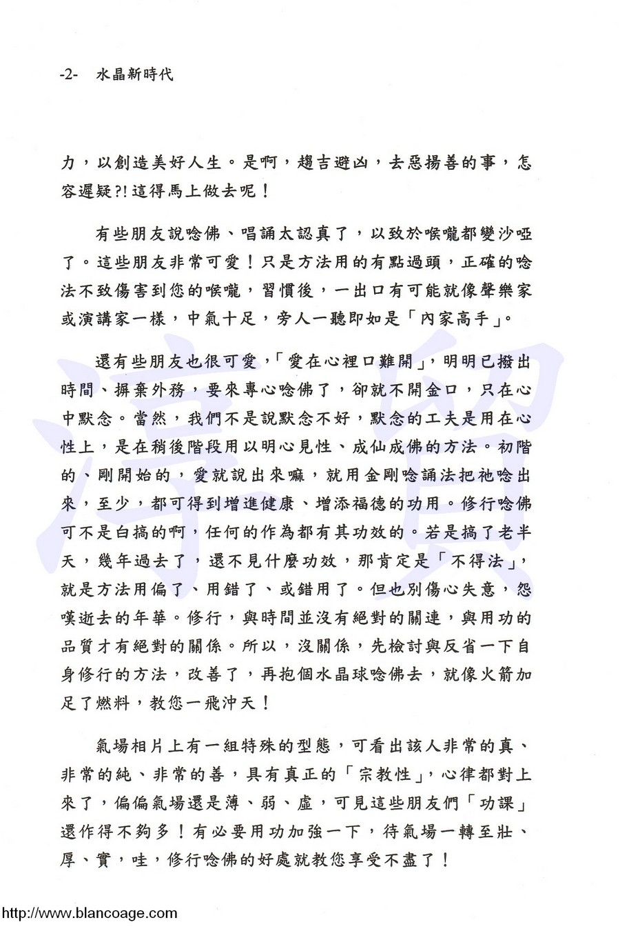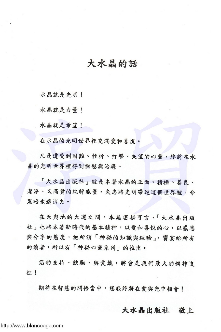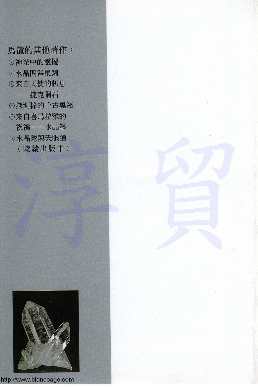 | 「水晶新時代」一書是節錄自淳貿工司85~87(1996~1998)年間,每個月邀請函上的精彩短篇文章。這是在玩水晶人士、五術、宗教、修行界中,流行最廣,影響力也最大的系列文章。儘管這些年是台灣有史以來,宗教、經濟、治安、飛安、空安最不穩定的年份,誠然如作者所言,「是新時代來臨前的陣痛!」書中不忘隨時提醒大家戴上微笑,換上輕鬆、幽默的心情,為生活中加入「靜心」的品質,則外面的紛亂根本不會打擾到你內心的平靜。這是一本有趣,含意卻也極為深遠的書!