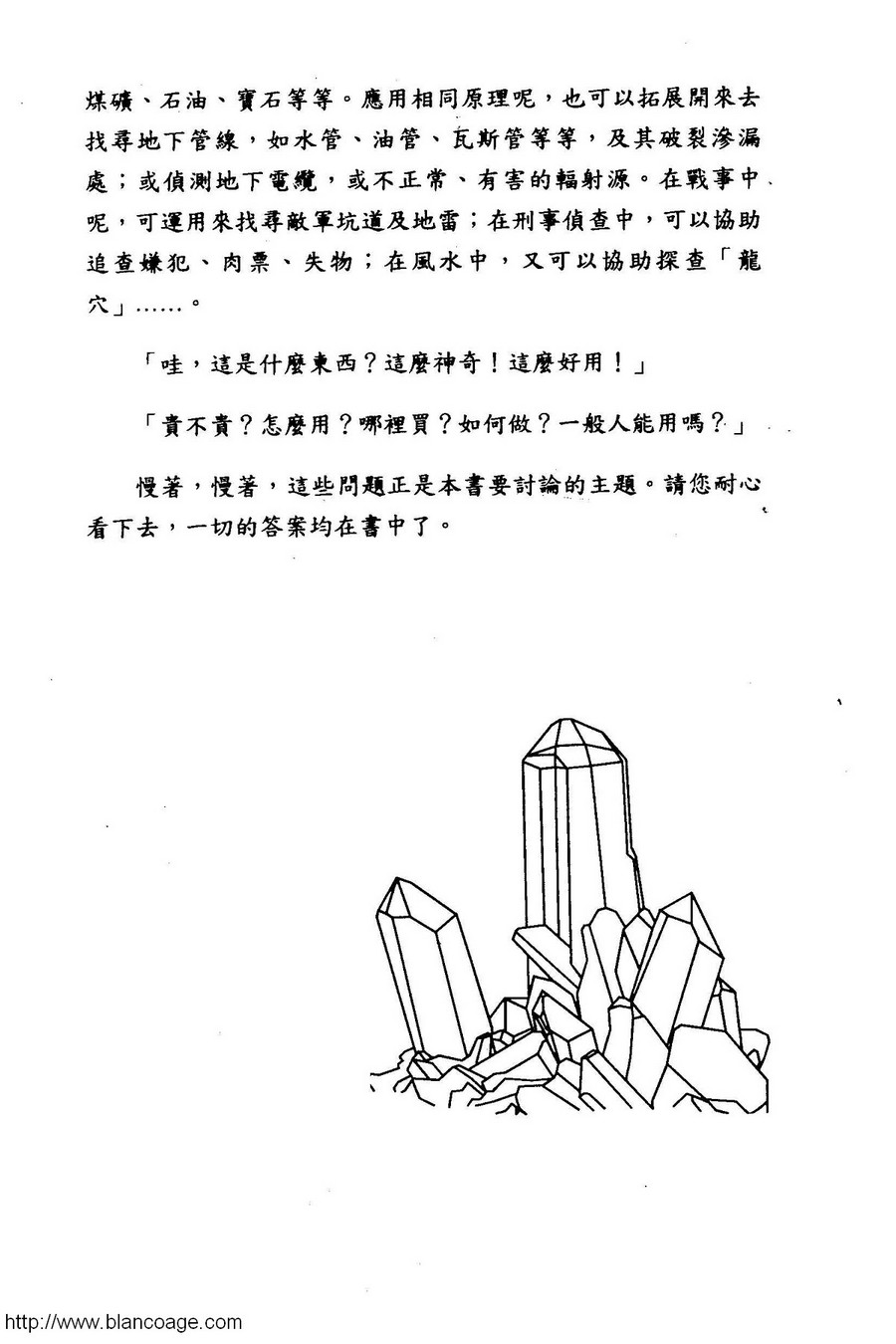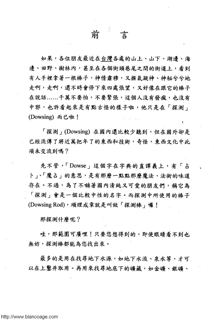 在東西文化的密切交流當中。探測棒(Dowsing Rod)不知是有心或無意之間獨獨被遺漏了。在西方已被廣泛使用在探尋水源、礦脈、尋人、破案等方面,超過一萬年的歷史,神密學家,實業家,官方都給予以十分的肯定。本書係有條理、有系統、有秩序地完整介紹探測棒的原理及使用方式、資料豐富,舉例貼切,相片精彩,研讀者必可受益無窮。